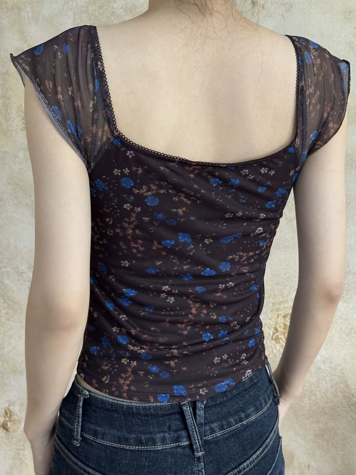 Dustybrim American Sweetheart V-Neck Floral Mesh Crop Top